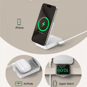 - Sạc đồng thời 3 thiết bị: iPhone (MagSafe), AirPods (sạc không dây), Apple Watch (dock riêng).